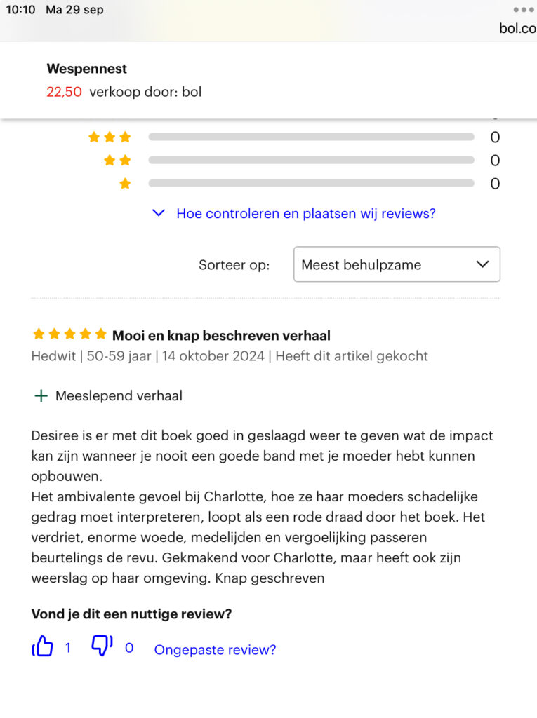 Ingrid, ‘heel knap dat de personages zo diep werden uitgewerkt, zo goed werden neergezet. Door de diverse karakters vond ik het boeiend en vroeg me aldoor af hoe het verder ging.’